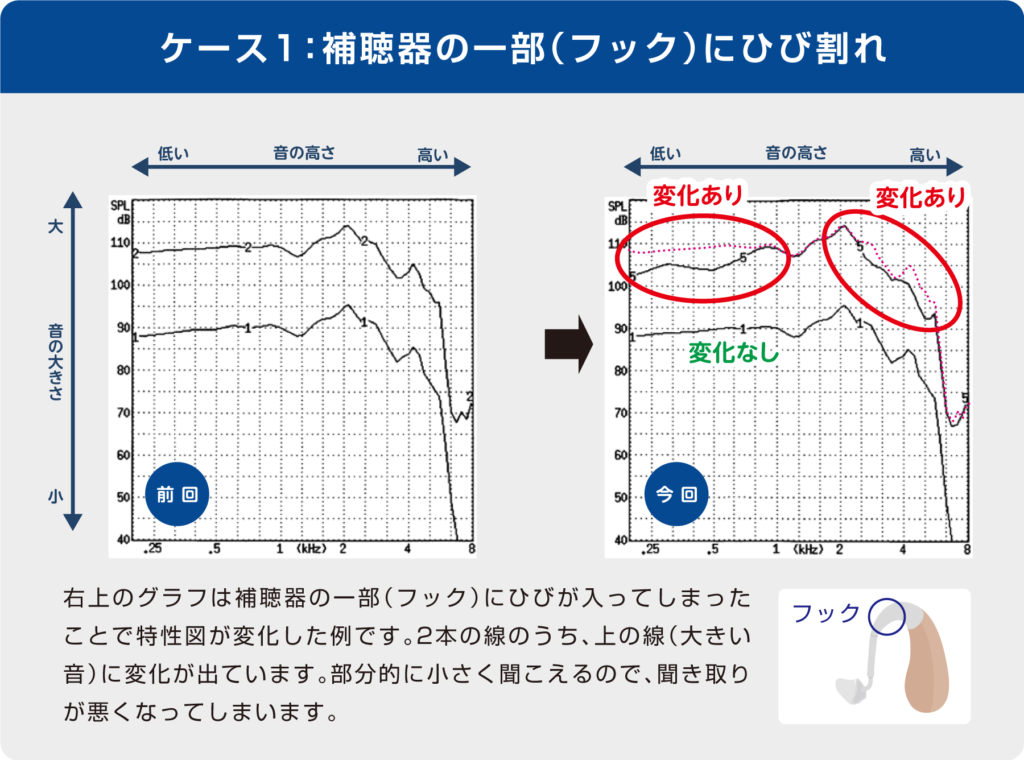 補聴器に何かトラブルがあると、特性図に変化が表れます。前回調整をした時の特性図と比較することで、補聴器が正常に音を出しているか確認できます。