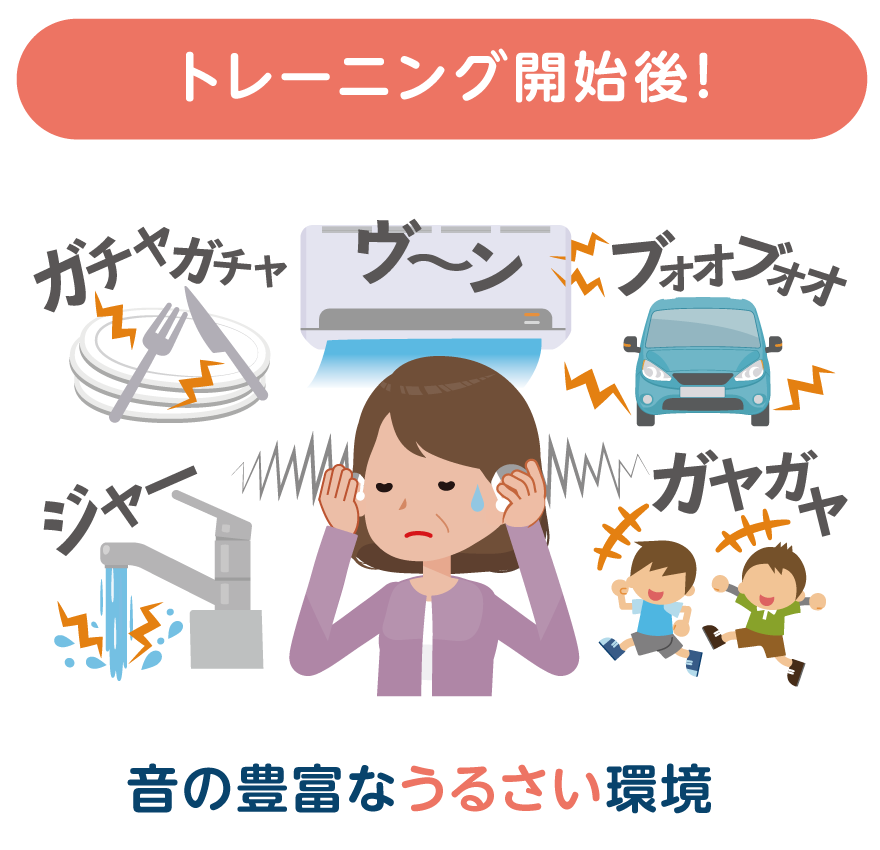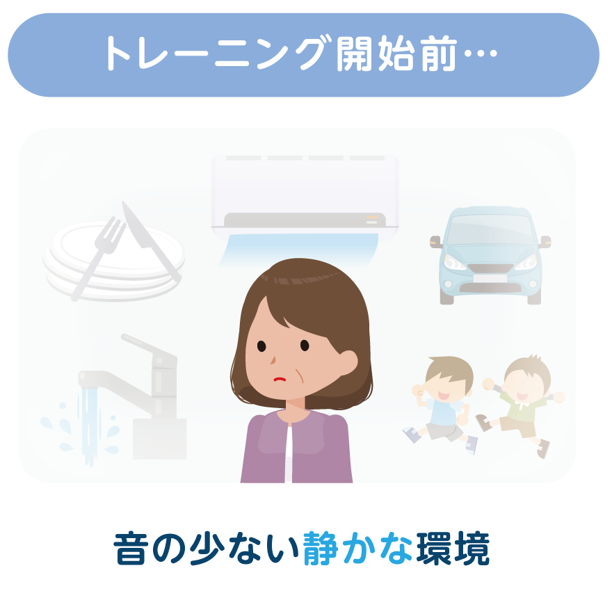 「難聴の脳」は、トレーニング開始後の「音が豊富にある環境」をうるさくて不快に感じてしまいます。このとき補聴器をつけたり外したりしてしまうと、脳はどちらの環境に合わせれば良いか分からなくなり「難聴の脳」から変化することができません。脳がまだ慣れていない最初の1ヵ月ほどは、つらいのが当然。あせらずに続けていきましょう。