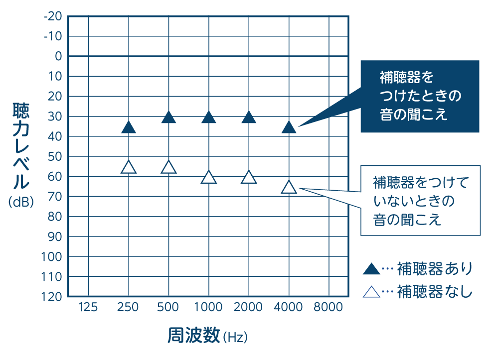目標値:50〜60dBの音に対して、補聴器をつけたときの数値(▲)が、補聴器をつけていないとき(△)のもっとも高い数値と同じか、少し上のレベル