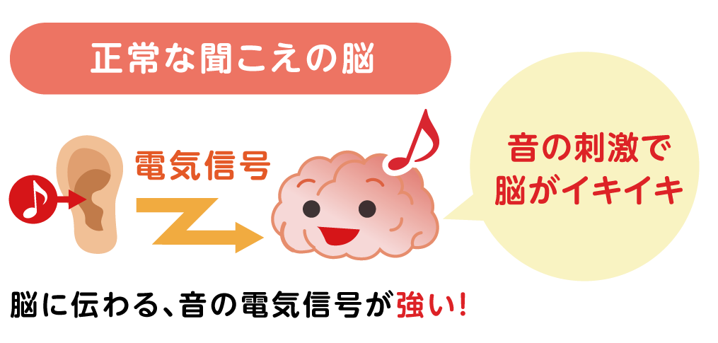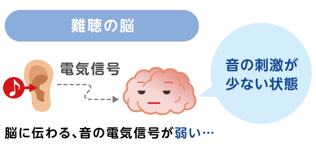 正常な聞こえの脳は、耳から伝わる電気信号(音の刺激)で常に活性化されています。加齢による難聴の場合、耳の機能低下は少しずつ進行します。自分では気づかないうちに脳が音の刺激の少ない状態に慣れてしまうのです。それが、難聴の脳です。