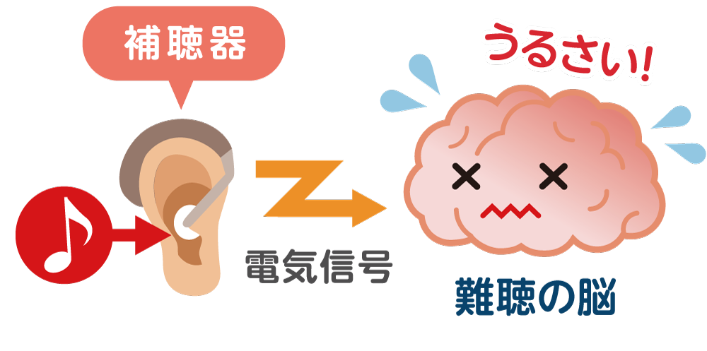 音の刺激の少ない状態に慣れてしまった「難聴の脳」に、補聴器を使って聞きとりに必要な音量の音を伝えると、はじめは「うるさい」「余計な音」と感じてしまいます。そのため、「難聴の脳」には補聴器の音に慣れるためのトレーニングが必要です。