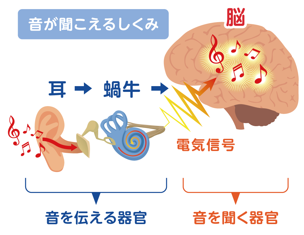 音は耳の中の器官(蝸牛)で電気信号に変わります。それが脳に伝わり、私たちは「音」として感じることができます。耳は音を伝達する器官で、実際に音を聞いているのは脳だといえます。難聴とは、耳の器官の機能が低下することで、脳に伝達する電気信号が減少している状態をいいます。