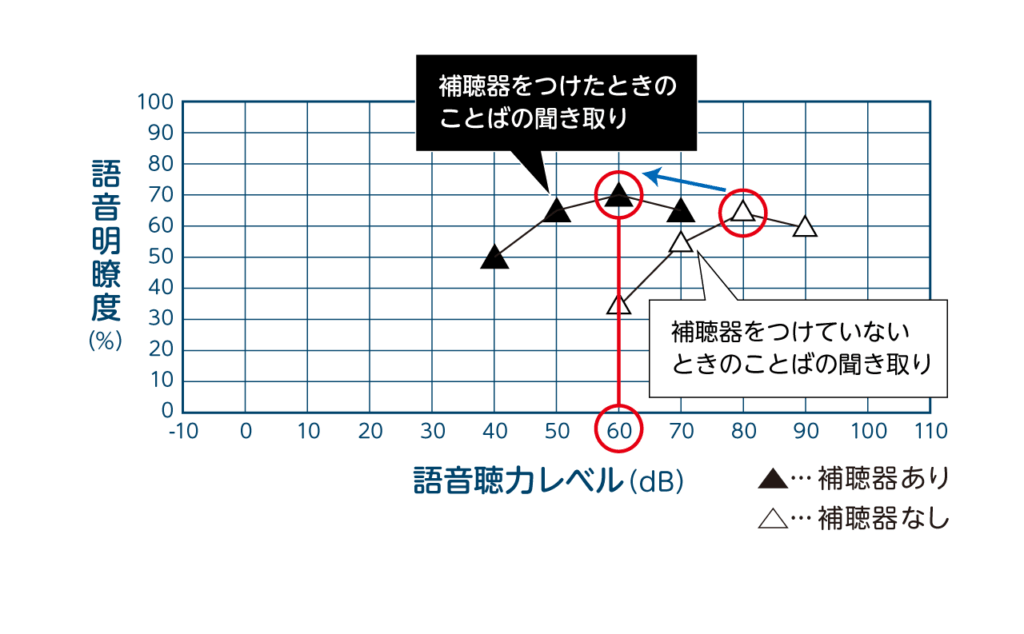 ことばの聞き取りの検査では、まず補聴器をつけていない状態で聞き取りが最も良い数値を確認します。下図では、語音明瞭度65%のところが最も良い数値です。次に補聴器を着けた時、60dBで語音明瞭度がこの数値と同じになるか、少し高めになるのが適切な目安です。