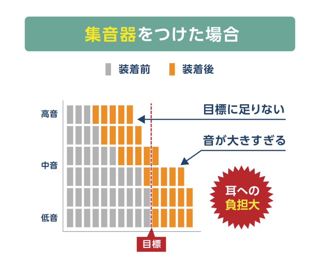 一般的な集音器は、全体的に音を大きくします。聞き取りを良くしようと、聞こえにくい高音を基準に音量を上げると、低い音が大きくなりすぎて耳へ負担をかけてしまいます。