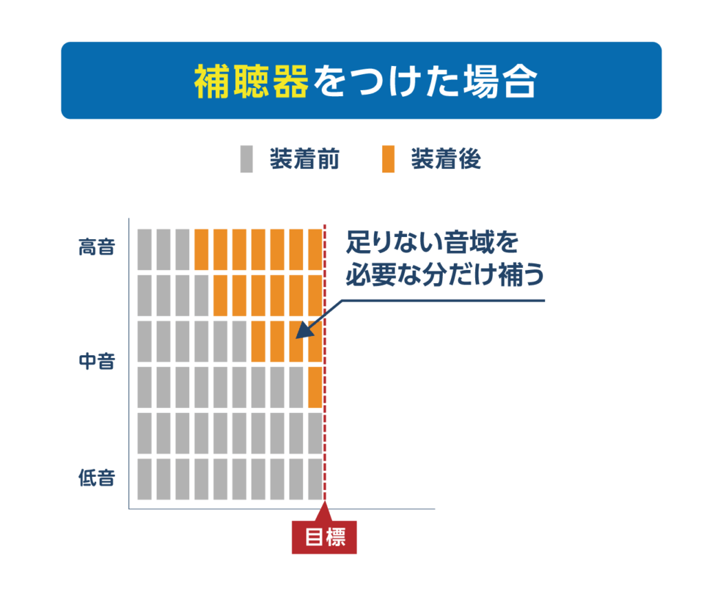 補聴器は、聴力を検査して、その結果に合わせた調整ができます。調整は、高度な知識を持った専門家にしかできません。検査でわかった音の足りない部分に、しっかりと音を入れることで、その人の聞こえにあった、ちょうど良い補聴を行うことができるのです。